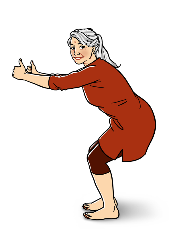 2. Die Oberschenkel kräftigenKräftigt die Beine und tut dem Rücken gut Stellen Sie Ihre Füße hüftbreit auf und ziehen Sie dann Ihr Gesäß weit nach hinten – so, als ob Sie sich auf einen Stuhl setzen wollten. Zeitgleich führen Sie Ihre Arme in Schulterhöhe nach vorne. Achten Sie darauf, Ihre Knie nicht über die Fußspitzen hinauszuschieben. 10–20 Wiederholungen |