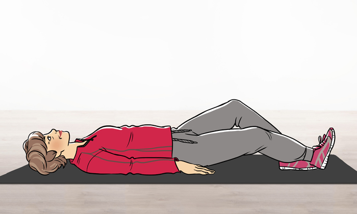 Legen Sie sich auf den Rücken und winkeln Sie Ihre Beine an. Die Arme liegen seitlich neben Ihrem Körper. Dann heben Sie Ihr rechtes Bein ein kleines Stück nach oben und strecken es mit angezogener Fußspitze über dem Boden aus. Danach winkeln Sie es in der Luft an und strecken Ihre Fußspitze.
