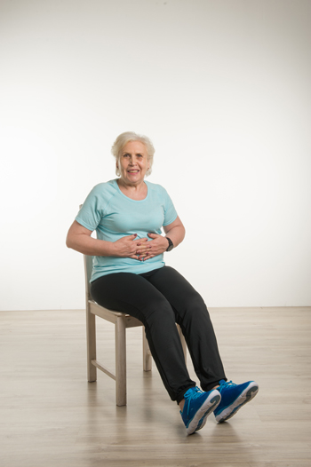 Setzen Sie sich aufrecht auf einen Stuhl und führen Sie Ihre Hände an den Bauch. Dann strecken Sie Ihre Unterschenkel etwas nach vorne und ziehenIhre Fußspitzen nach oben und senken sie wieder ab.