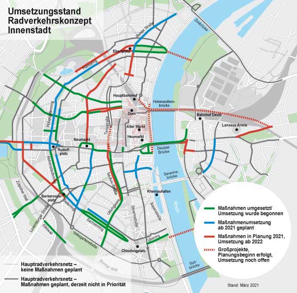 „Es war fast vierzig Jahre lang nichts für die Fahrradfahrer gemacht worden“, erklärt der Kölner ADFC-Vorsitzende Christoph Schmidt. Der ADFC findet es nicht nur wichtig, dass jetzt einzelne Straßen zugunsten von Radfahrenden umgestaltet werden, sondern dass auch durchgängige Fahrrad-Achsen durchs Stadtgebiet entstehen.