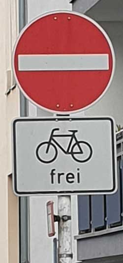 Seit einiger Zeit ist es erlaubt mit dem Rad bei dieser zusätzlichen Beschilderung entgegen der Einbahnstraße oder in die Fußgängerzone zu fahren. |