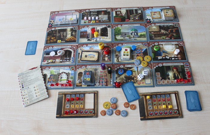 Zugegeben, wir haben etwas gebraucht, bis wir alle Spielzüge verstanden hatten. Denn neben den Regeln der Fortbewegung des Kaufmanns und seiner Gehilfen auf dem sehr schön gestalteten Spielfeld gelten für jeden der 16 Orte eigene Regeln, Waren gegen Lira zu kaufen oder auch einzutauschen. So schaut man gerade anfangs öfter in die Anleitung. Auch will ich nicht verschweigen, dass vor allem die Waren für die Handkarren eher etwas für ruhige Hände sind und die Warenbilder auf den Marktkarten etwas für gute Augen. Letztlich sind sie aber an der Farbe doch erkennbar. Überhaupt gefällt uns die Ausstattung des Spiels: die liebevollen Illustrationen der Orte, die Spielfiguren und Warensteine aus Holz, die Geldstücke … nur die Rubine sind aus Plastik.
