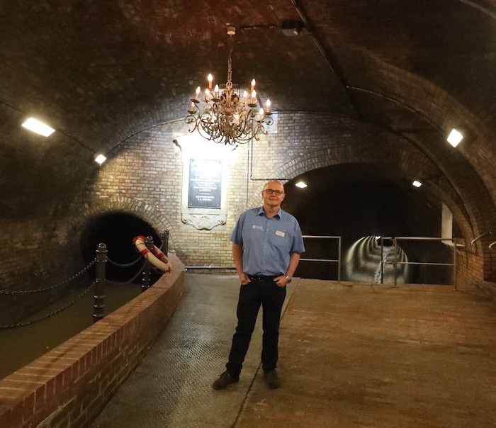 Dass er bis heute ein funktionierender Bestandteil des Kölner Abwassersystems ist, wird am Geruch deutlich. „Wie stark es riecht, hängt immer von den Niederschlägen ab“, sagt Schmitz. Das Bauwerk sieben Meter unter der Erde wurde 1890 fertiggestellt, erzählt er.