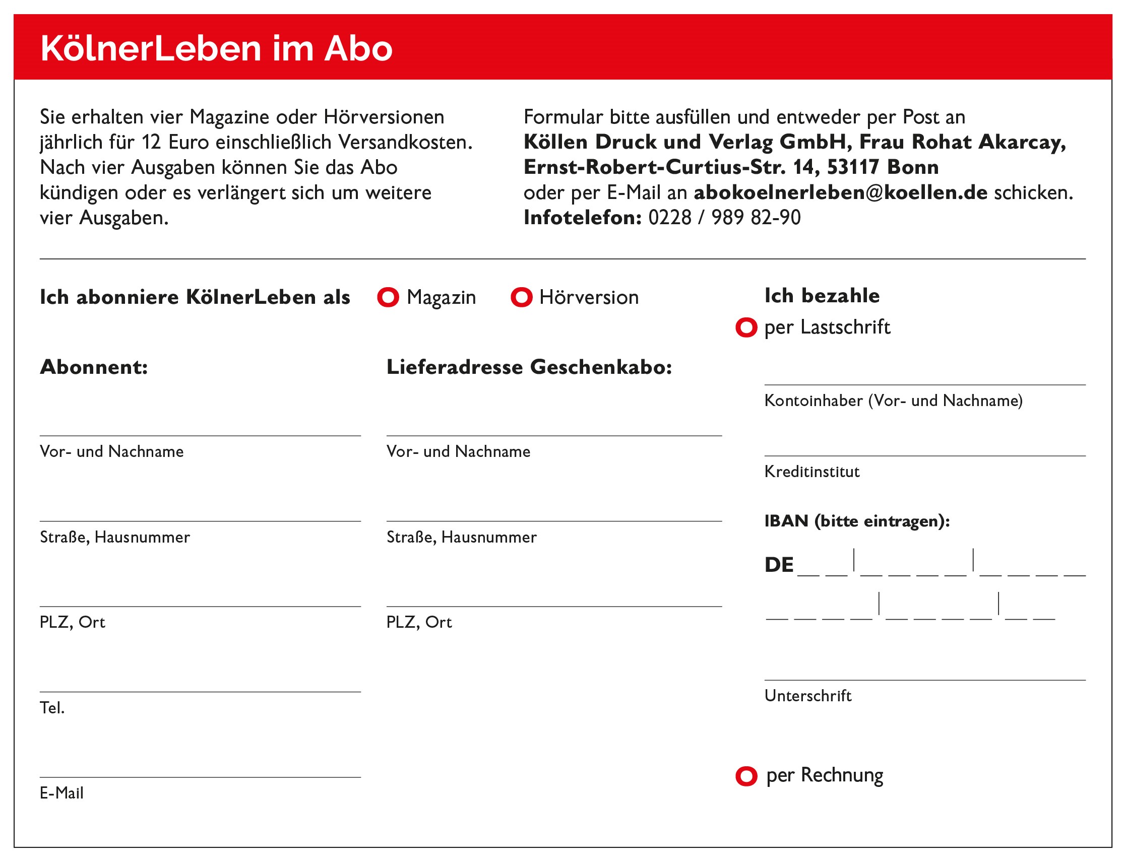 Sie wollen KölnerLeben im Abo lesen oder verschenken? Einfach Formular als Pdf-Datei (550 KB) herunterladen, ausdrucken und per Post oder per E–Mail senden.