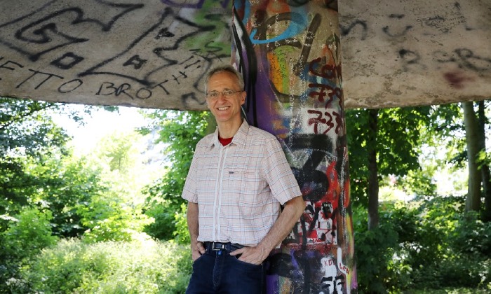 Klaus Herda unter dem Wetterpilz im Nordpark. Foto: Bettina Bormann