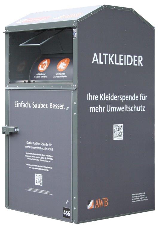 In Köln gibt es verschiedene Möglichkeiten. Da wären zum einen die rund 540 flächendeckend aufgestellten Container der Abfallwirtschaftsbetriebe (AWB). Jörg Daniel, stellvertretender Pressesprecher der AWB, erklärt: „In den Altkleider-Container kann saubere und tragbare Kleidung jeder Art eingeworfen werden. Dazu gehören zum Beispiel T- Shirts, Hosen, Jacken, Mützen und Hüte, Schuhe oder kleinere Lederartikel wie Gürtel, Taschen, Tischdecken, Vorhänge und Gardinen, Bettwäsche und Bettdecken und vieles mehr.“