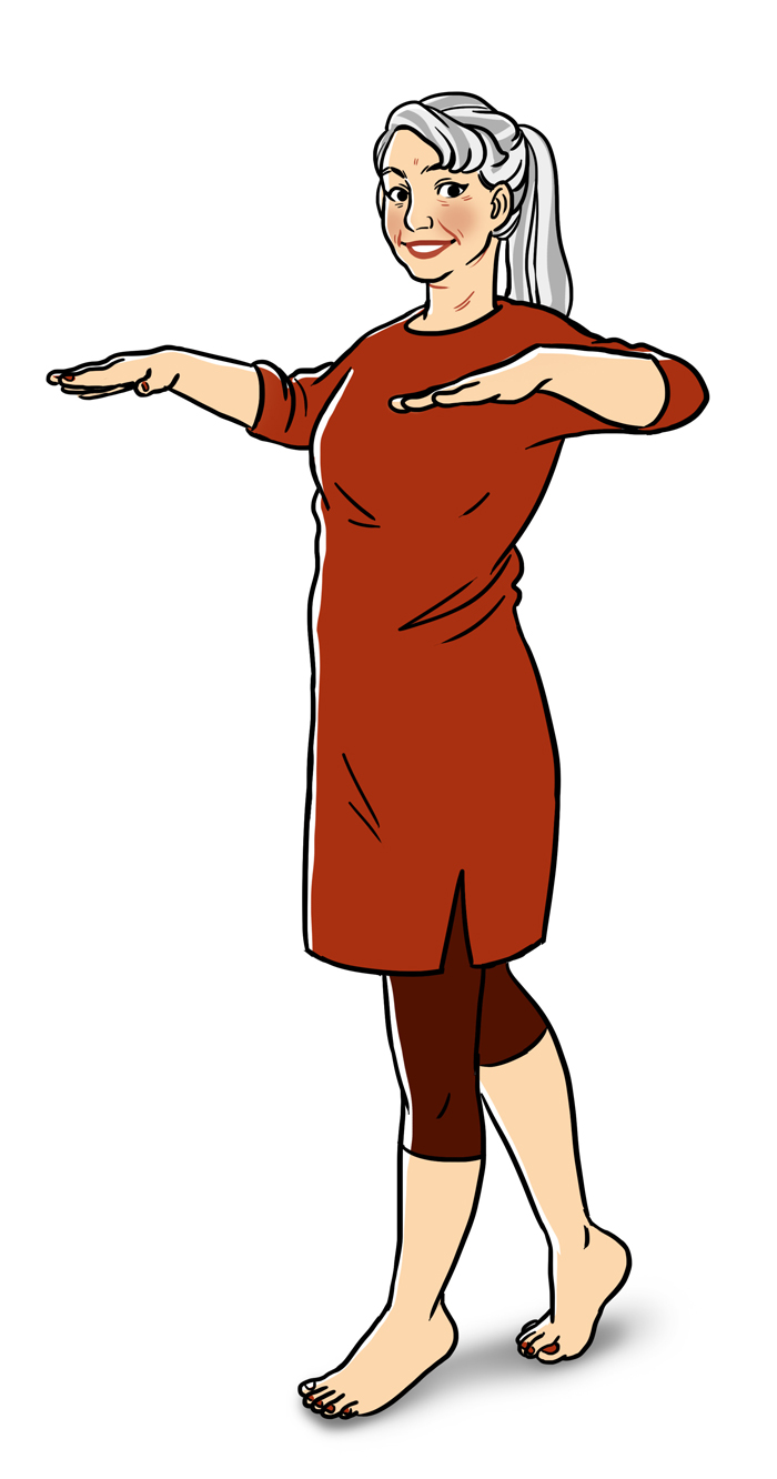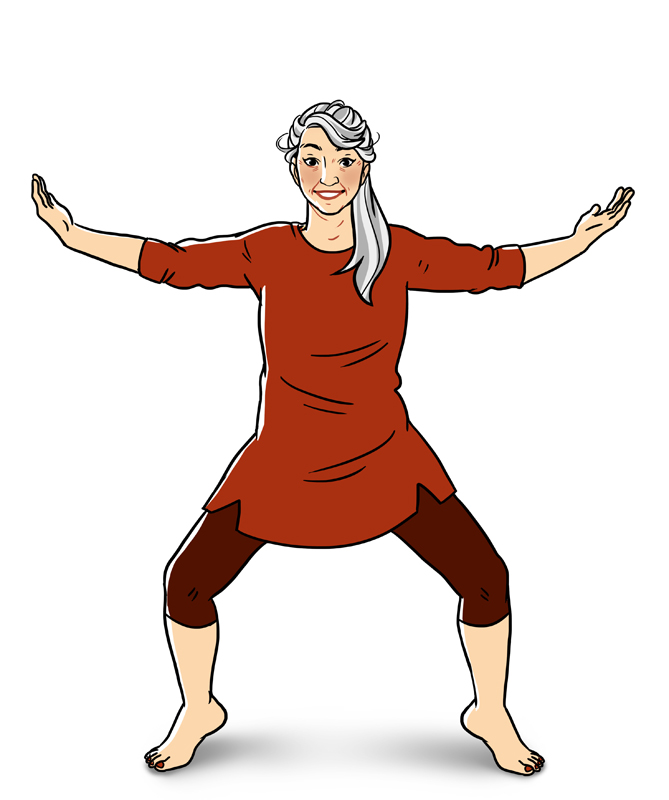 3. Das Gleichgewicht stärkenEine gute Übung für Gleichgewicht, Füße und Beine Stellen Sie Ihre Füße etwas mehr als hüftbreit auf. Ihre Knie und Fußspitzen zeigen dabei nach außen. Nun senken Sie etwas Ihr Becken. Dabei ziehen Ihre Knie noch ein Stück weiter nach außen. Jetzt kommen Sie langsam auf Ihre Fußspitzen, ohne dass sich Ihre Körperhöhe verändert. Ziehen Sie dabei Ihre Arme in Schulterhöhe weit nach außen. Das unterstützt den natürlichen Bewegungsfluss und hilft Ihnen, die Balance zu halten. 10–20 Wiederholungen |
