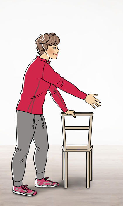 Stellen Sie sich seitlich neben einen Stuhl und fassen Sie mit einer Hand an die Stuhllehne. Dann pendeln Sie Ihren freien Arm an der Körperseite vor und zurück.
