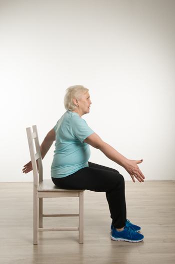 Setzen Sie sich aufrecht hin und pendeln bei gesenkter Schulter Ihre Arme gegengleich vor und zurück.