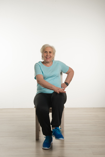 Setzen Sie sich aufrecht auf einen Stuhl und führen Sie Ihre Hände an den Bauch. Dann strecken Sie Ihre Unterschenkel etwas nach vorne und ziehenIhre Fußspitzen nach oben und senken sie wieder ab.