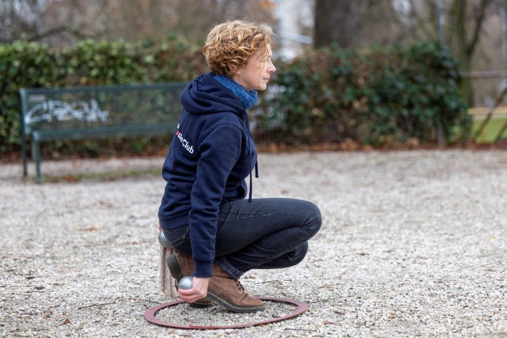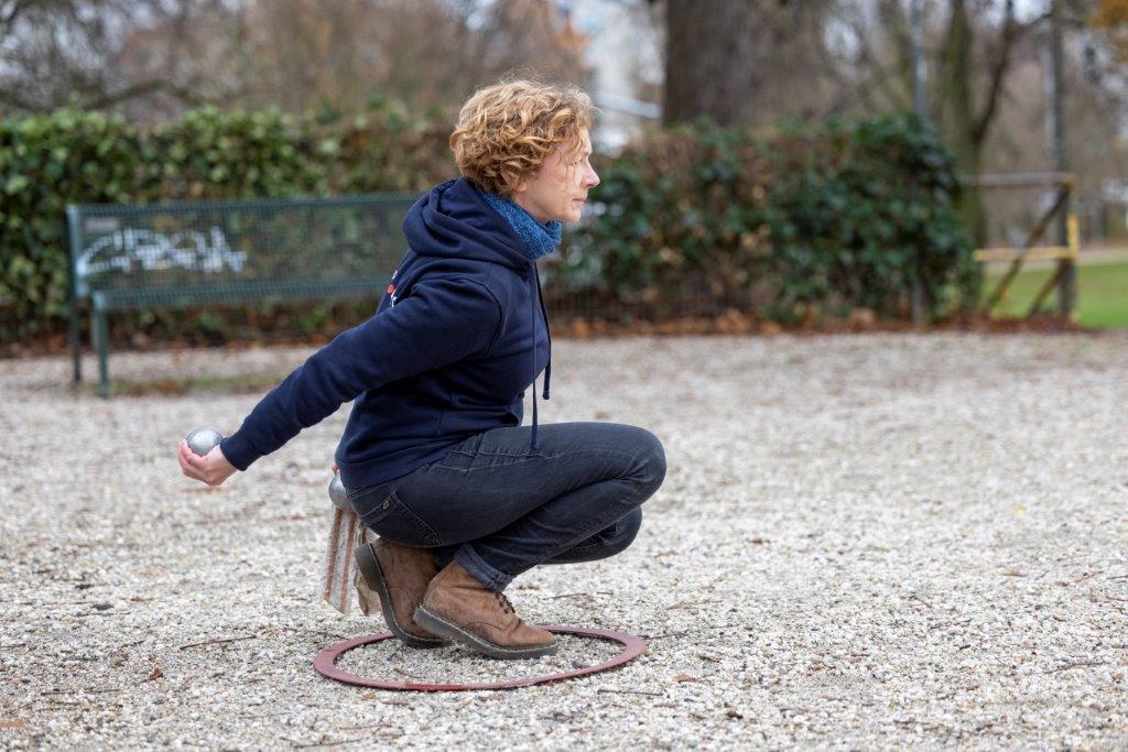 Brigitte Wieg, 67, zeigt, wie man eine Boulekugel legt. Fotos: Thomas Banneyer