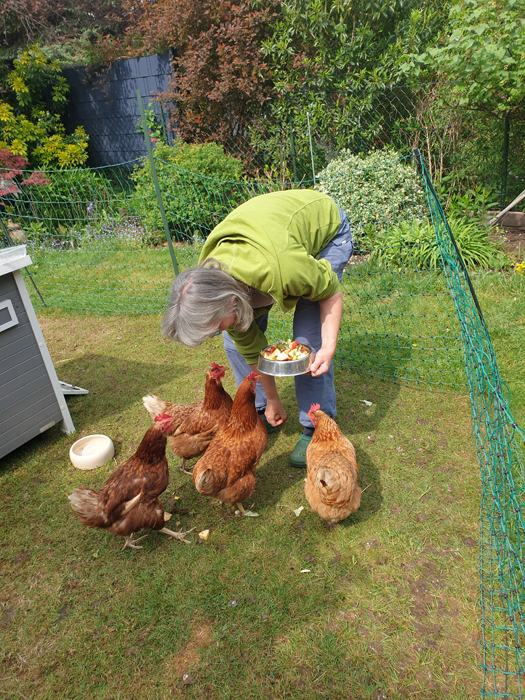 Drei Wochen vergehen wie im Fluge, dann heißt es Abschied nehmen, ihre Abholung steht an. Die Versuche meines Mannes, den Hühnern über die Zeit kleine Kunststücke beizubringen, haben nicht so gefruchtet. Ich ahne aber, blieben sie länger, gelänge ihm auch das. Dumm sind sie nicht! Meine anfänglichen Sorgen um den Rasen und die Beete haben sich bestätigt: Die Hühner haben rücksichtslos ganze Arbeit geleistet, waren Rasenmäher und Vertikutierer in einem. Daher bin ich froh, dass ihr Gartenteil ohnehin zur Bearbeitung anstand. Ein Trost: Den vielen Kot kann man gut als Gartendünger verwenden. Ihr sanftes Gurren werde ich vermissen. Ihre lautstarke Aufregung, wenn es Futter gibt. Ihren aus einer nie zu stillenden Neugier entspringenden Eifer, wenn wir die Terrassentür öffneten und sie – egal aus welcher Ecke – sofort zum Zaun gerannt kamen, um uns zu begrüßen. Ob wir ihnen zu oft zu viele Leckerbissen gereicht haben?