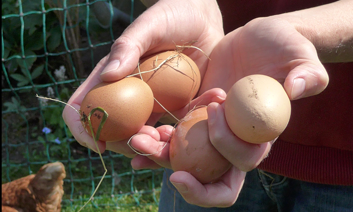 Heute wollen wir die ersten Eier essen. Doch in welchem Zustand? Hartgekocht? Gebraten? Gerührt? Wir entscheiden uns für Spiegeleier, so sehen wir die sattgelben, stattlichen Dotter am besten. Der Geschmack? Einfach lecker! Wir haben uns schon an das Dasein der Damen im Garten gewöhnt. An das Gackern, an das Füttern, ans Putzen. Wir setzen uns im Gartenstuhl an den Zaun, hören zu, beobachten, zeigen, lachen. Wundern uns, wie tief die Mulden im Erdreich schon geworden sind und wie genussvoll sie sich darin „suhlen“, gerne auch mal zu zweit.