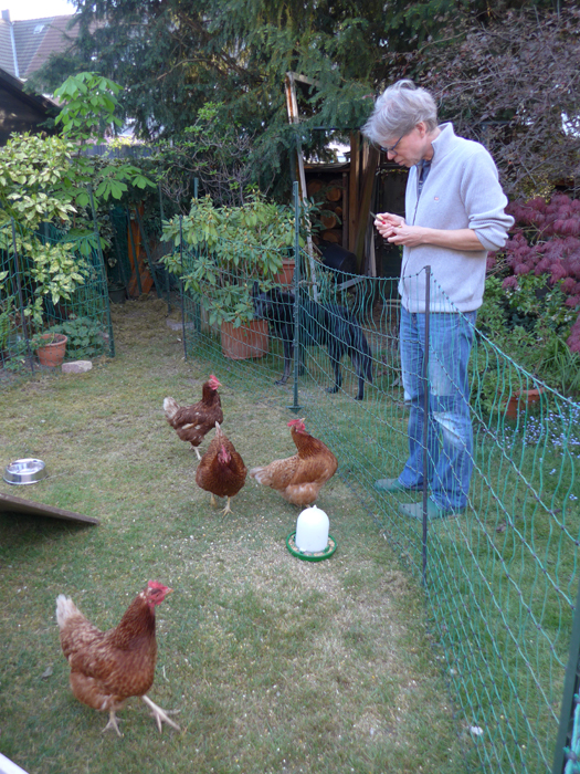 Das Ehepaar verfrachtet sie inklusive Utensilien in unseren Garten: ein hübsches Hühnerhaus, Wassernapf und Futterglocke, Futter sowie Heu für die Gelege, dazu Stangen und ein Schäferzaun. Nachdem das Terrain abgesteckt ist, gibt es eine Einweisung in die Pflege und Futtertipps.