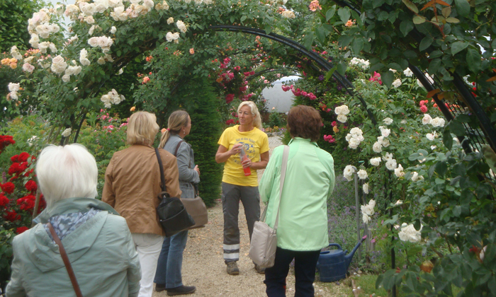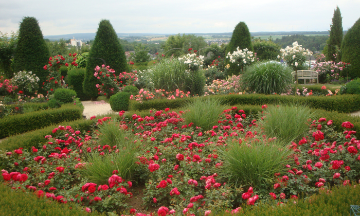 Rosenbögen, an denen Kletterrosen in die Höhe streben, öffnen den Blick ins Karree. In der Mitte strecken über hundert dunkelrote Floribunda-Rosen mit dem beeindruckenden Namen „Mona Lisa“ ihre Köpfe der Sonne entgegen. Tee- und Edelrosen in allen Farben stehen in den das Rund umgebenden Beeten, darin Kaskadenrosenstämme in verschwenderischer Pracht. Was für ein Blühen, was für ein Duften. Summen und Zwitschern erfüllt die Luft. Ein guter Ort zum Verweilen – Bänke gibt es genug.