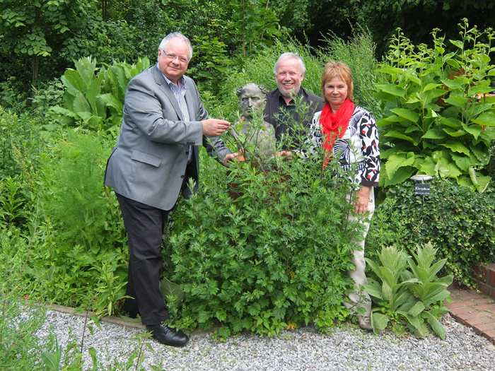 Autor Hans-Joachim Breuer mit Peter Germann und Gudrun Zeuge-Germann an der Büste des antiken griechischen Wundarztes und Naturforschers Galenos von Pergamon. Foto: pab/PytAro