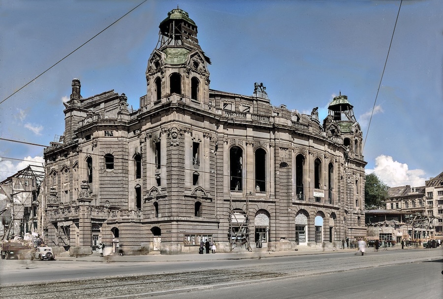 Das Foto von 1946 zeigt den Zustand der Oper nach der Beschädigung durch einen Bombenangriff im Jahr 1943. Rheinisches Bildarchiv Köln, rba_640918. Kolorierung: Klaus Hausmann, Wegen de Leut media